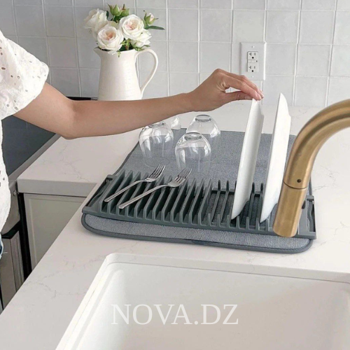 يجمع بين رف تجفيف عملي و قاعدة ماصة من المايكروفايبر تمتص الماء بسرعة وتحافظ على سطح المطبخ نظيف وجاف